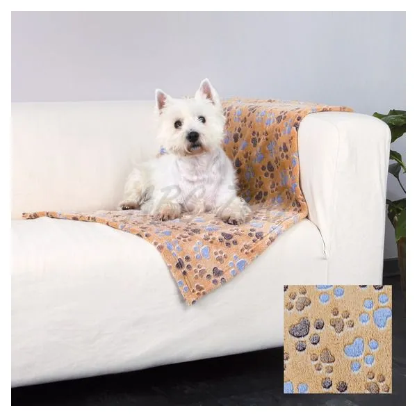 Béžová fleecová deka s labkami modrej a hnedej farby. Chráni čalúnenie pred chlpmi psov. Na studený povrch.