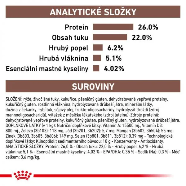 ZLOŽENIE: ryža, živočíšne tuky, kukurica, pšeničný lepok, dehydratované bravčové bielkoviny, kukuričný lepok, rastlinná vláknina, hydrolyzovaná hydinová pečeň, minerálne látky, čakanková vláknina, rybí tuk, sójový olej, frukto-oligosacharidy, hydrolyzované kvasnice (zdroj mannán-oligosacharidov), výťažok z nechtíka lekárskeho (zdroj luteínu). Zdroje bielkovín: dehydratované bravčové bielkoviny, kukuričný lepok, pšeničný lepok, hydrolyzovaná hydinová pečeň.