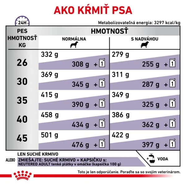 Krmivo vhodné pre kastrované dospelé psy veľkého plemena s hmotnosťou v dospelosti nad 25 kg s predispozíciou priberať na hmotnosti. Viac detailov