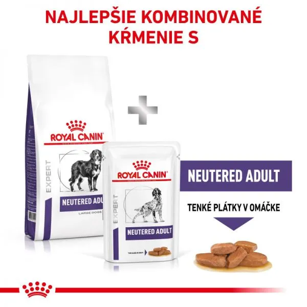 Aby sa vyhovelo individuálnym preferenciám každého psa, ROYAL CANIN® NEUTERED Adult je k dispozícii aj ako mokré krmivo s tenkými plátkami v omáčke.*