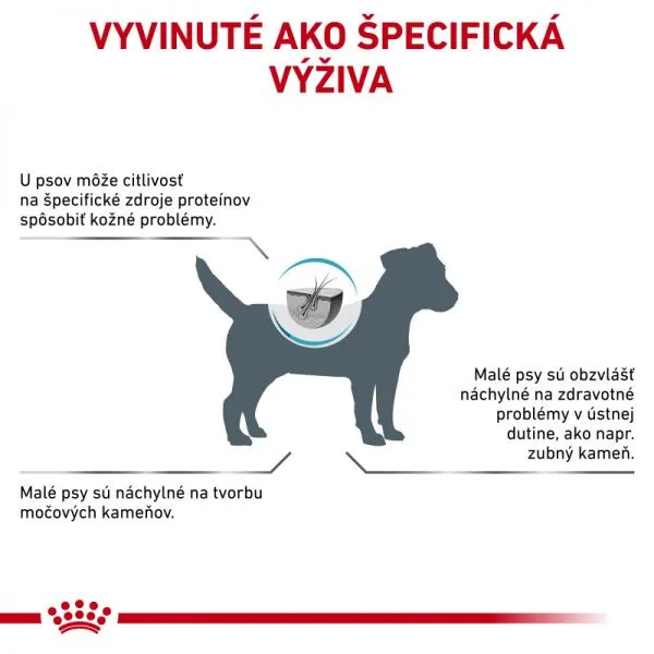 Špeciálna hypoalergénna veterinárna diéta pre dospelé psy malých plemien do 10 kg trpiace potravinovými alergiami a problémami s trávením.