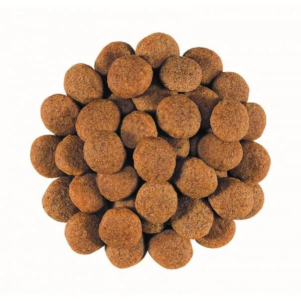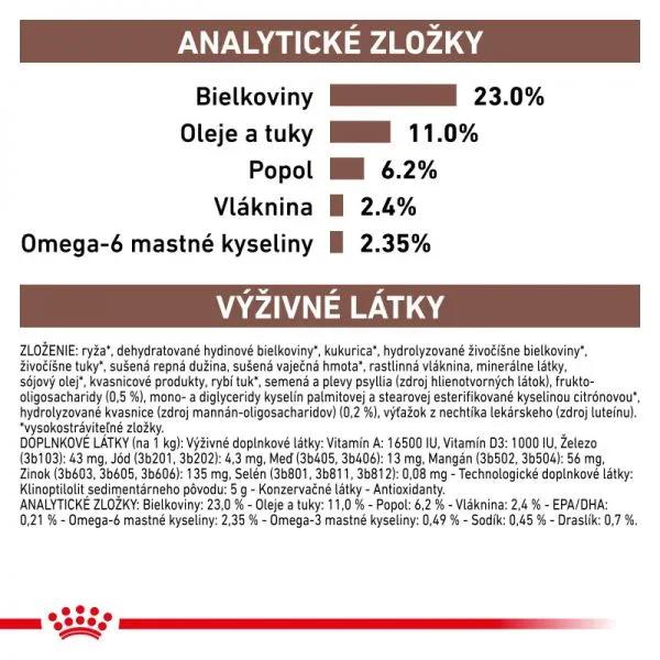 ZLOŽENIE: ryža*, dehydratované hydinové bielkoviny*, kukurica*, hydrolyzované živočíšne bielkoviny*, živočíšne tuky*, sušená repná dužina, sušená vaječná hmota*, rastlinná vláknina, minerálne látky, sójový olej*, kvasnicové produkty, rybí tuk*, semená a plevy psyllia (zdroj hlienotvorných látok), frukto-oligosacharidy (0,5 %), mono- a diglyceridy kyselín palmitovej a stearovej esterifikované kyselinou citrónovou*, hydrolyzované kvasnice (zdroj mannán-oligosacharidov) (0,2 %), výťažok z nechtíka lekárskeho (zdroj luteínu). *vysokostráviteľné zložky.