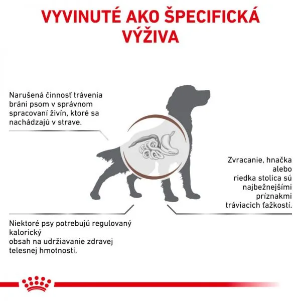 Špeciálna veterinárna diéta so zníženým obsahom kalórií pre dospelé psy so sklonmi k nadváhe trpiace ochorením tráviaceho traktu.