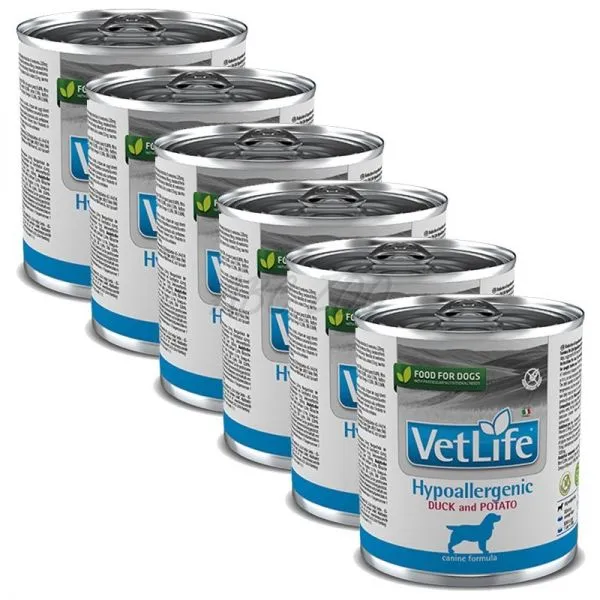 Farmina Vet Life Hypoallergenic Duck & Potato je kompletné krmivo pre psy, odporúčané na manažment pacientov s potravinovou alergiou, potravinovou intoleranciou a tiež na zlepšenie kvality kože a srsti v prípade dermatóz a nadmerného vypadávania srsti.