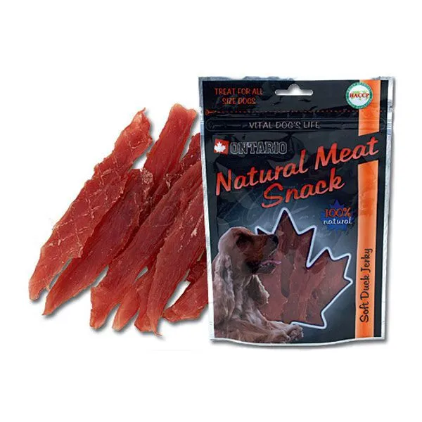 Pochúťka pre psov ONTARIO - Soft Duck Jerky je určená pre psov. Maškrta je v tvare kačacích plátkov. Snack je 100%-ný prírodný produkt.