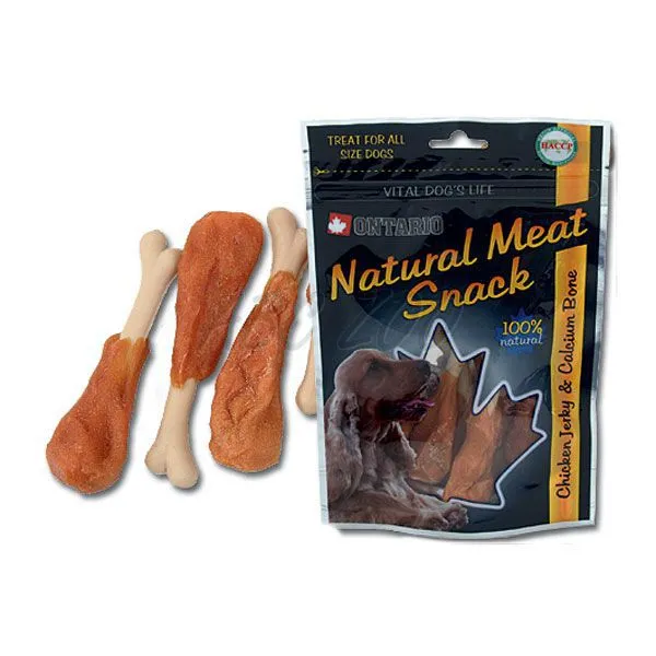 Pochúťka ONTARIO - Chicken Jerky and Calcium Bone je určená pre psov. Maškrta je v tvare kuracieho stehna s kalciovou kostičkou. Snack je 100%-ný prírodný produkt.